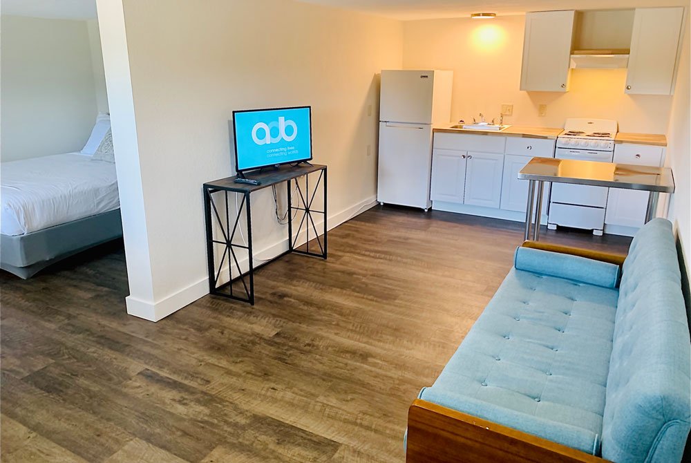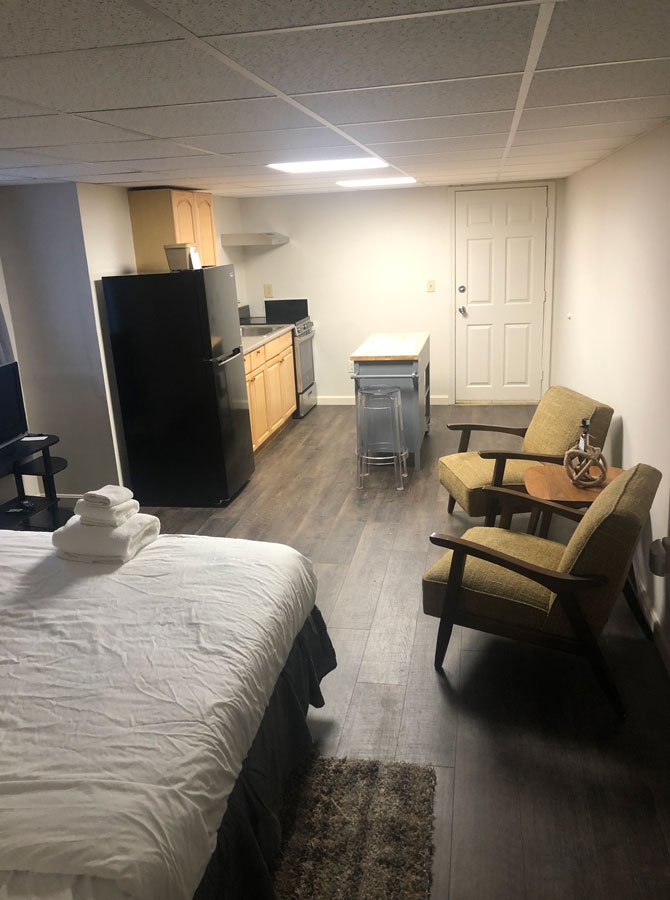 For guests traveling with kids, our ground floor Retro Suite just might be the ticket. The unit boasts one queen size bed, a sofa pullout and room for a cot or two. It offers plenty of room to hang out on a rainy day. There’s one bathroom of average hotel size and a small closet and dresser for storage over a holiday weekend. And, having a kitchenette is divine! You’ll need to call us directly to book this room.